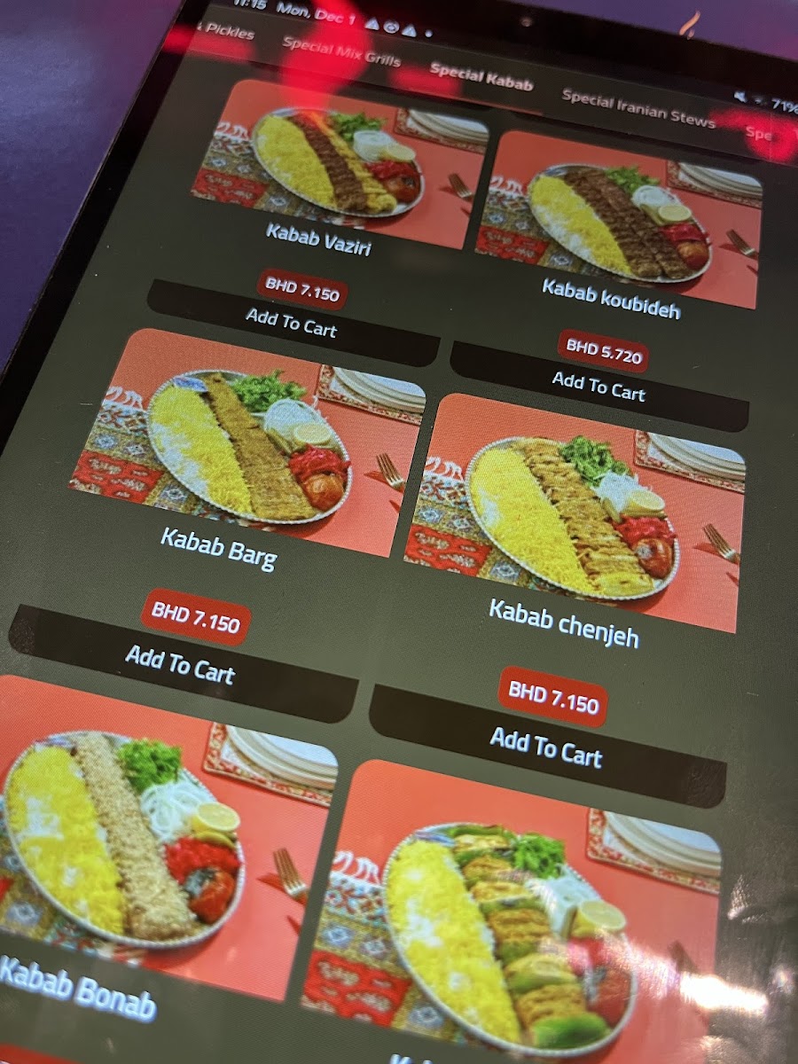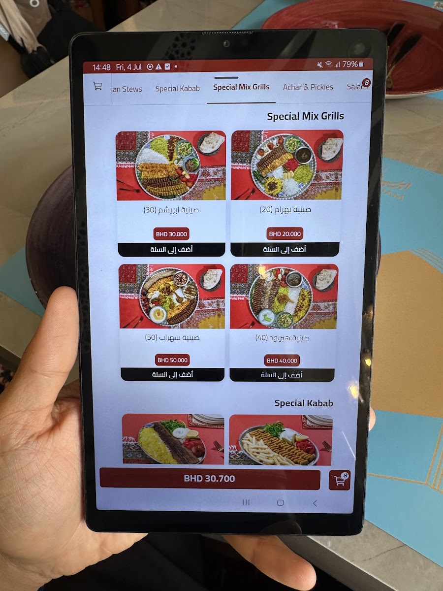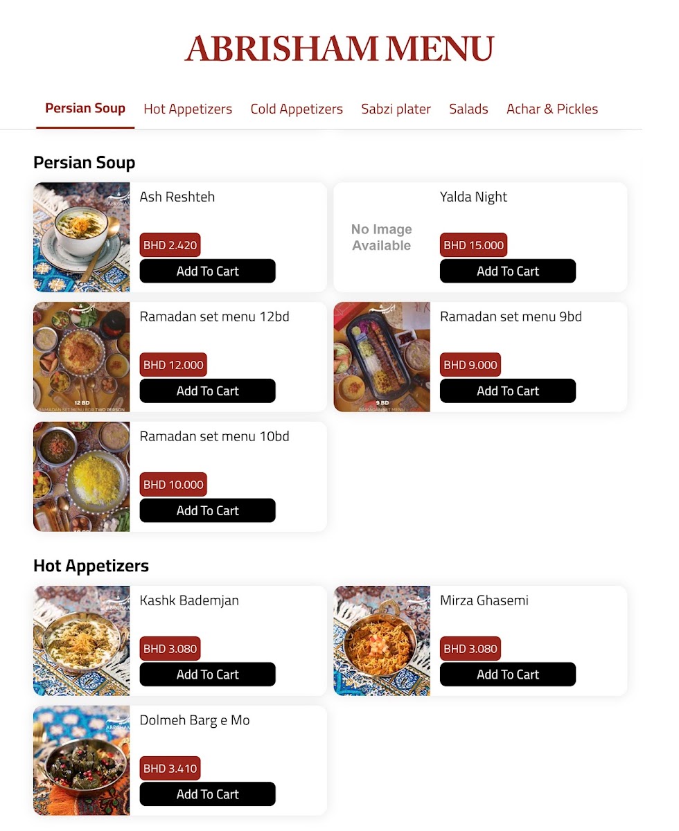 The Abrisham Bahrain | ابريشم البحرين مطعم ايراني Menu offers a rich blend of traditional Iranian flavors with a modern twist, served in a warm and inviting atmosphere. Located in the heart of Saar, Bahrain, this restaurant presents an array of mouthwatering dishes that highlight the best of Persian cuisine. From tender kebabs to flavorful stews, every dish is crafted using high-quality ingredients, offering a truly authentic taste of Iran. Whether you're in the mood for a savory main course or a light appetizer, the menu caters to all tastes, with something for everyone. With each bite, you'll experience the rich spices and herbs that define Persian cooking, making your meal not just a feast for the stomach but for the senses as well.